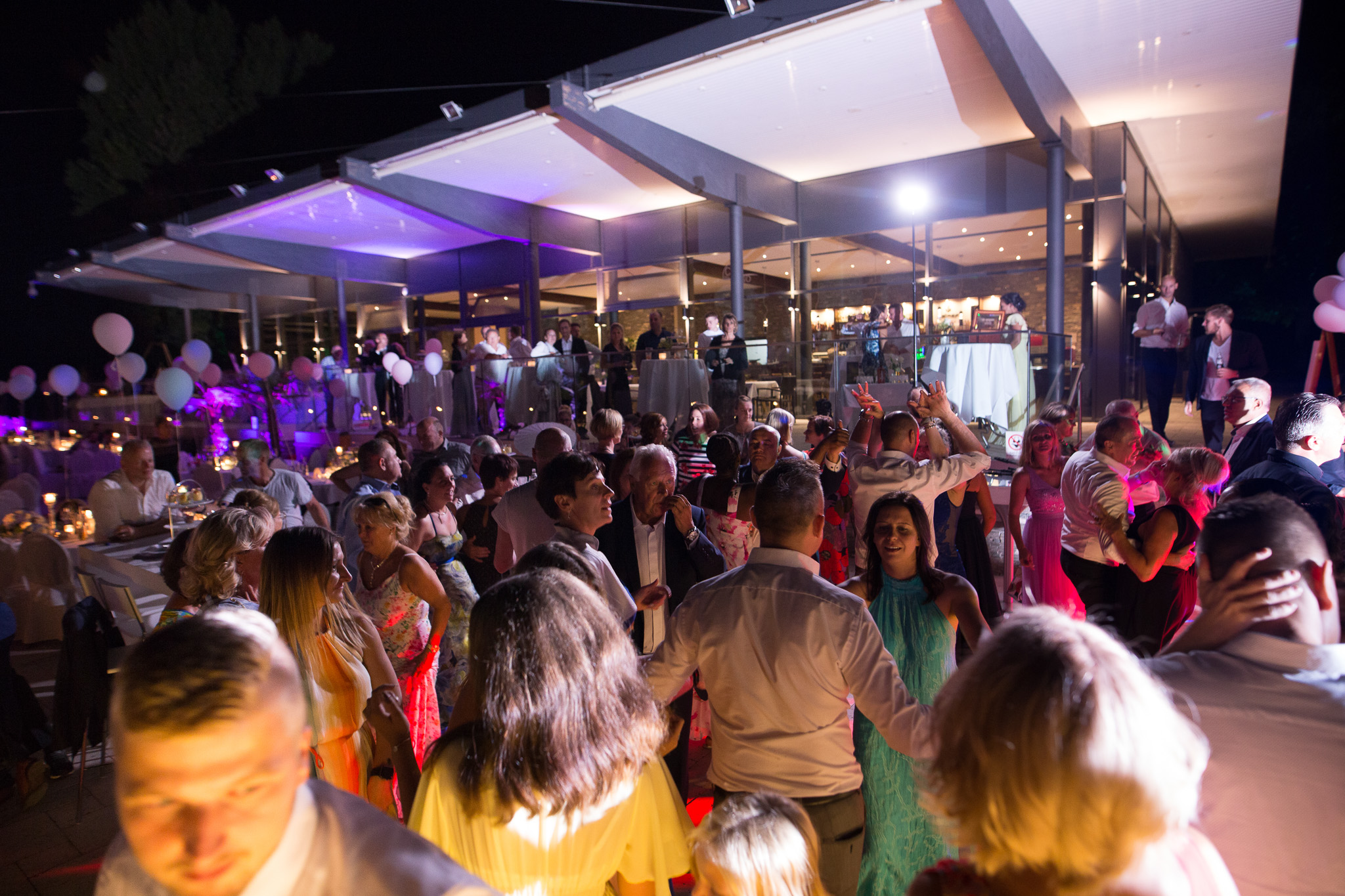 Das Café del Lago wurde für diesen besonderen Anlass in zarten Pastellfarbtönen gehalten und mit einer Vielzahl von Luftballons geschmückt, die eine fröhliche und festliche Atmosphäre schufen. Auf der unteren Terrasse fanden die Gäste ihre Plätze, während auf der obersten Terrasse ein beeindruckendes Grillbuffet aufgebaut war.