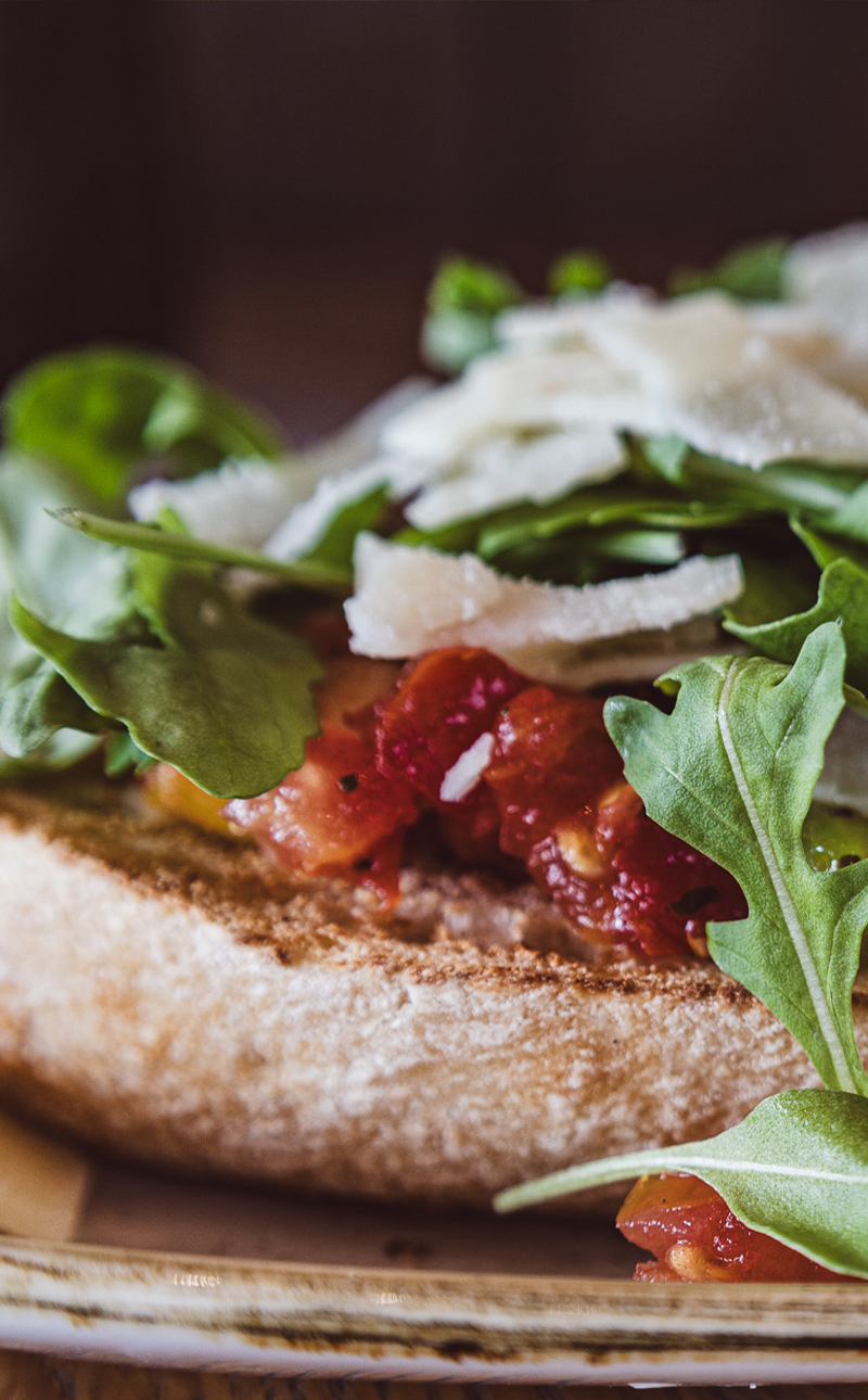 Geröstetes Ciabatta mit Tomaten, Paprika, Zwiebeln, Knoblauch, italienischen Kräutern und Champignons, garniert mit Rucola und Grana Padano
