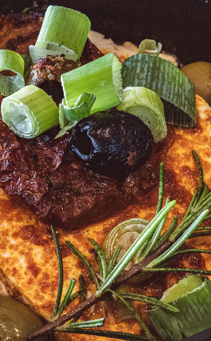 mit Chili-Knoblauch-Öl, Rosmarin, getrockneten Tomaten und Oliven, dazu Baguette